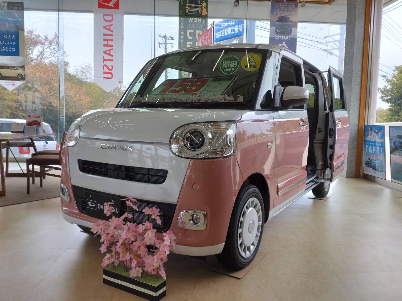 先日フルモデルチェンジしたムーヴキャンバスが届きました。ストライプスGとセオリーGターボの2台あります。以前のモデルには無かったターボの設定があります。ぜひお試し下さい。お待ちしております。